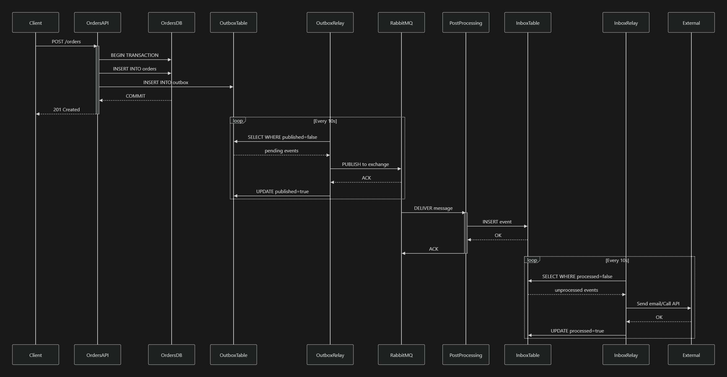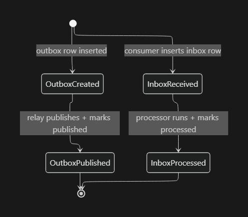 - A separate processor reads unprocessed inbox rows and runs business side effects